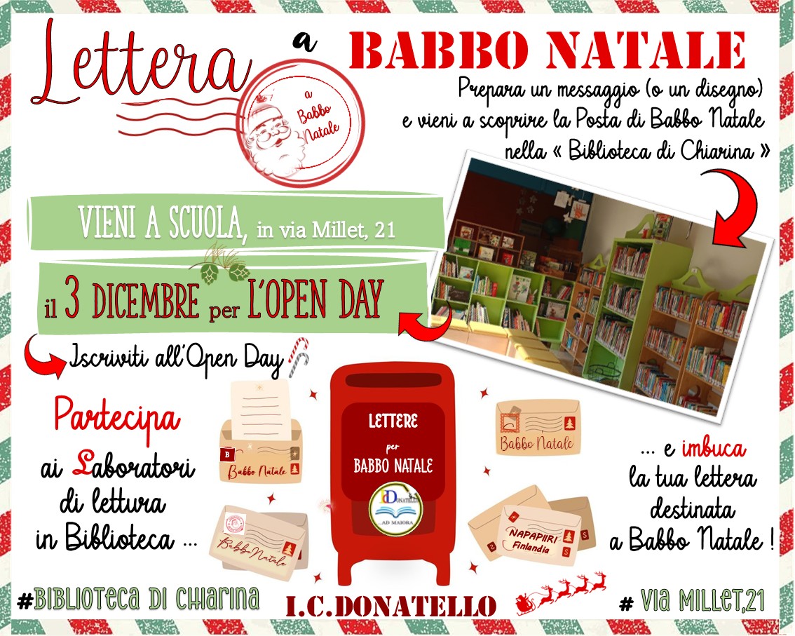 Vieni nella nostra scuola il 3 dicembre, dalle ore 17.00 alle 19.00, per l' Open Day. Partecipa ai Laboratori e porta il tuo messaggio per Babbo Natale.