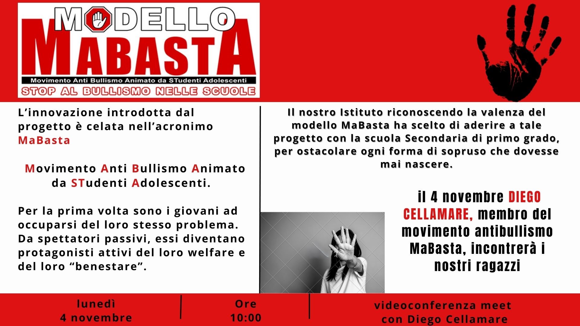 Il 4 novembre i ragazzi della Scuola Secondaria incontreranno DIEGO CELLAMARE, membro del movimento antibullismo MaBasta